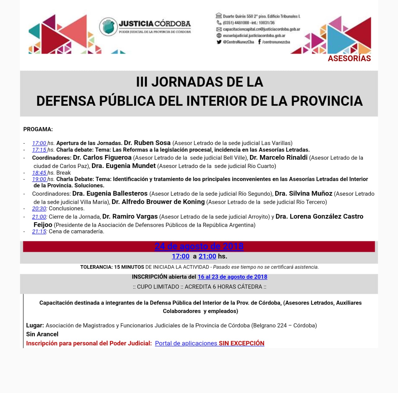 Lugar: Asociación de Magistrados y Funcionarios de la provincia de Córdoba – Belgrano n° 224 – Capital.